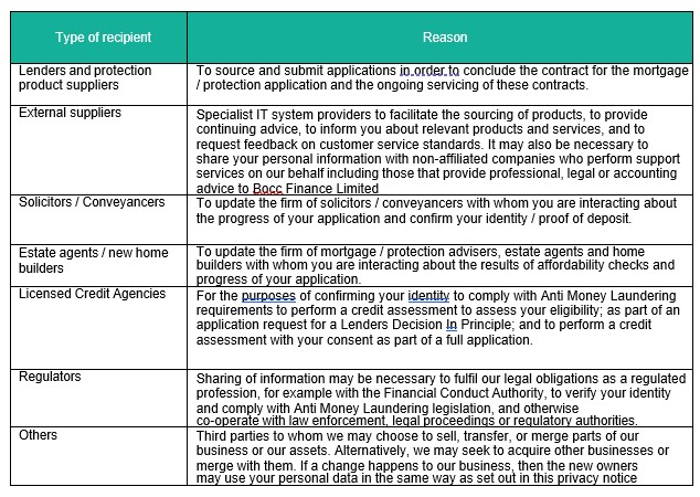 Where you do share information relating to any of these categories e.g., when you may share information about your health or a characteristic of vulnerability BOCC Finance Limited will always seek explicit consent from you to store and process such information.